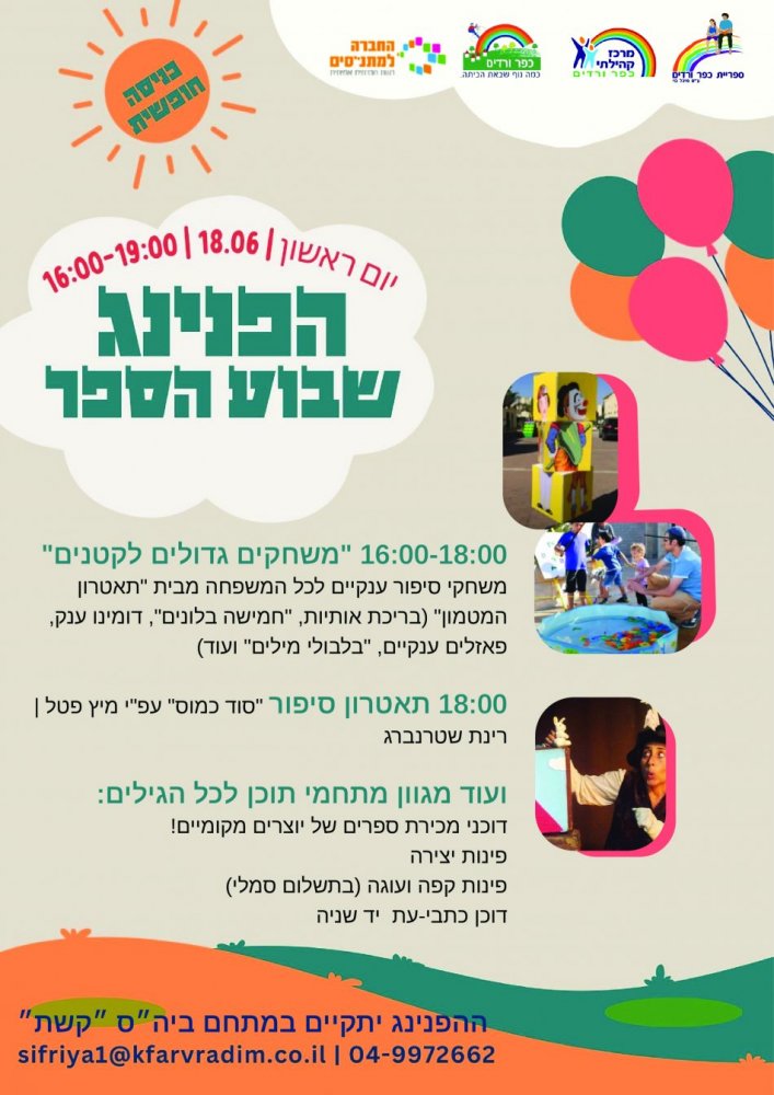 היום במתחם בית ספר קשת - פינות איפור מהספרים, שולחנות יצירה, תחנות הפעלה, מכירת ספרים של יוצרים מקומיים, קפה ועוגה, הצגה ועוד