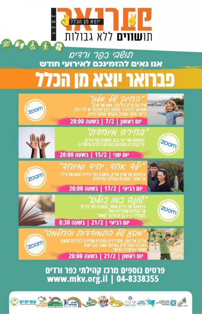 מצורף קישור לשיח עם חגית בודנקין, "החיוך של אלון- מאמהות מיוחדת ושכול ליצירה" - חגית, אמו של אלון, תספר את סיפורה האישי: איך מתחת לגוף הפגוע יש ילד רגיל, וכיצד מתוך השכול והקושי - צמחה יצירה. חגית מנחת סדנאות הכתיבה בספרית כפר ורדים, מחזאית ותסריטאית. המפגש ללא תשלום, והוא הראשון בין סדרת הרצאות לחודש "פברואר יוצא מן הכלל" שמתקיימות במרכז הקהילתי בזום.