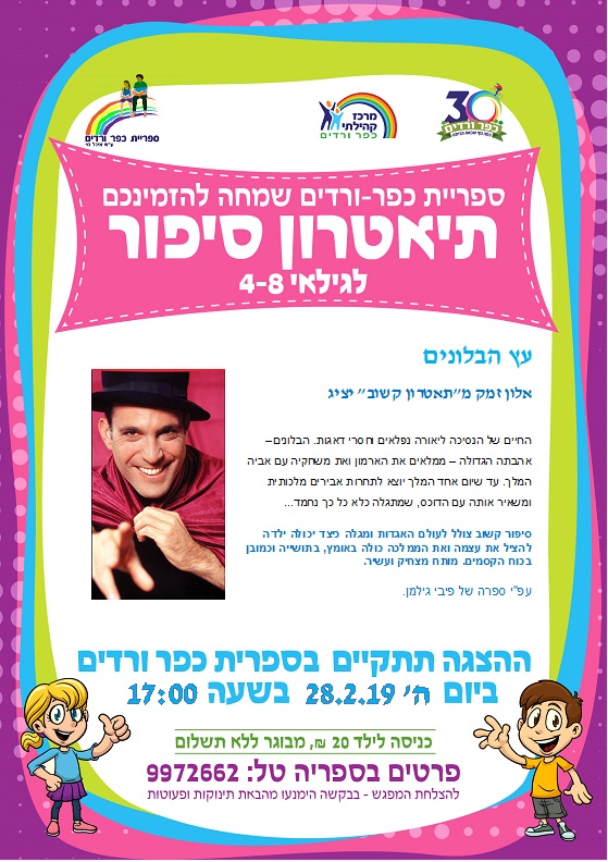 תאטרון סיפור לילדים מגיל 4 - בספריה. יום ה' 28/2 בשעה 17:00