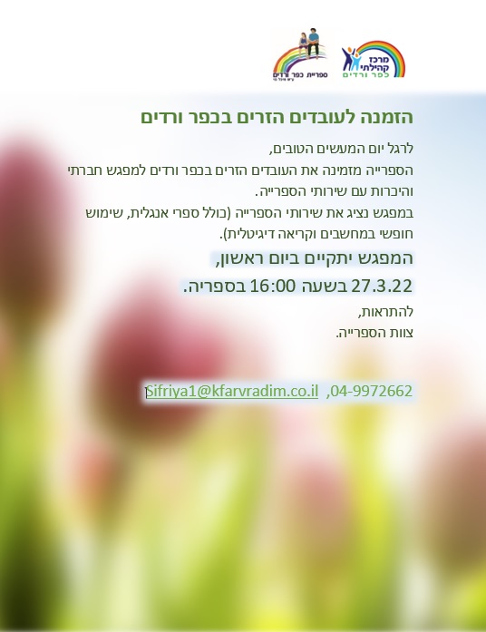 אני מזמינות את העובדים הזרים להכיר את שרותי הספרייה: שמוש במחשבים, הזמנת ספרים, שרותי אנגלית וספרייה דיגטלית בשפות שונות.