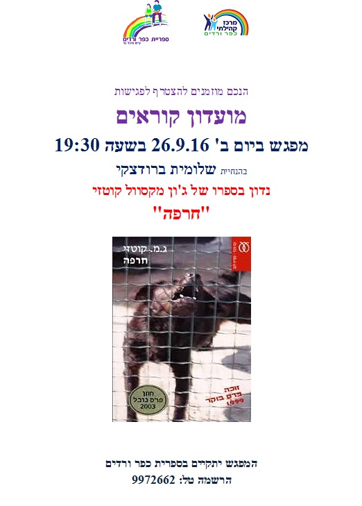 מפגש מועדון קוראים יום ב' 26.9 בשעה 19:30