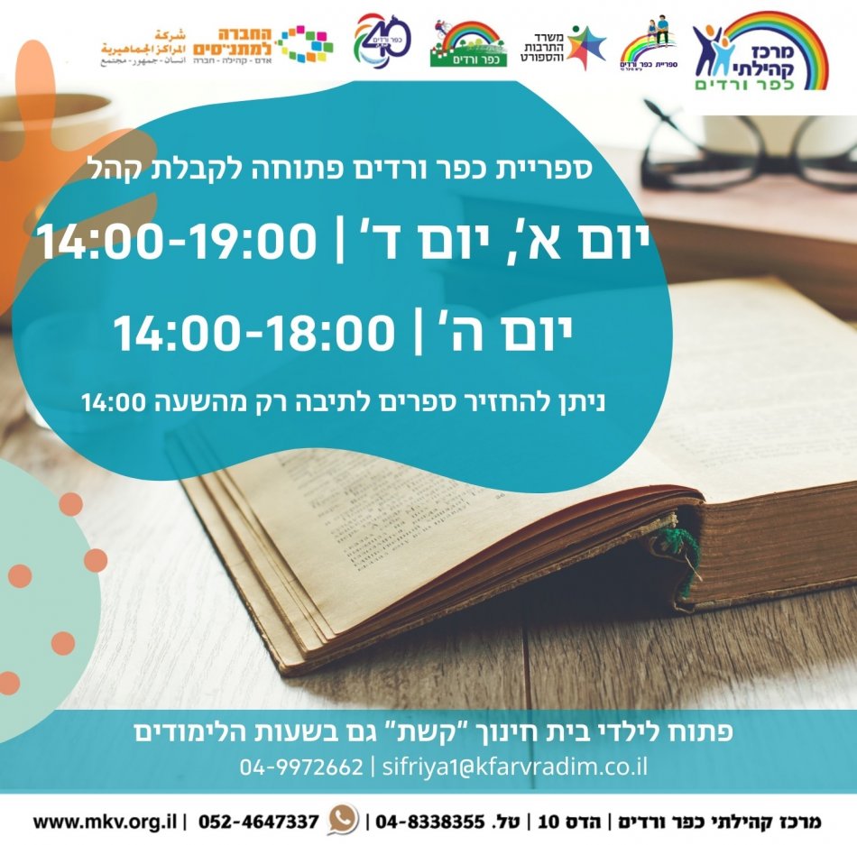 *שעות פתיחת הספרייה - ימים: א' ,ד' בין השעות 14:00-19:00 | יום ה' בין השעות 14:00-18:00